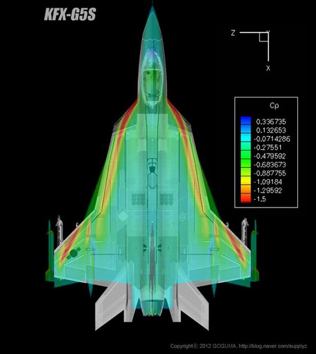 KFX有正常式布局的101方案和鴨式布局的201方案。KFX-101外形上類似于F-22,尺寸略小,采用了DSI進氣口設計,近乎于一種F-35的雙發型;另一種則為KFX-201,采用了鴨式布局并列雙發外傾式雙垂尾設計。飛機的前翼、主翼以及垂直尾翼均為梯形,前緣后掠角稍大而后緣前掠角較小,均互相平行。前翼沒有上反角,而且與主翼在同一平面上而不是高于主翼。尾翼設計也很普通,直接安裝在機身上的兩個外傾式垂直尾翼完全起不到對噴口紅外特征的遮擋作用。而且過于靠前、靠內的垂直尾翼在飛機大迎角飛行時完全被其機身和主翼的遮蔽。比較特別的是,為了保證對地面雷達的低可探測性,KFX-201的機頭為帶棱角的五邊棱錐。