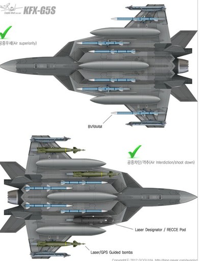 韓國公布的這組KFX-G5S戰機圖片中的另一關鍵技術要點是,有別于之前任何一款第五代戰機方案,韓國似乎在構想KFX-G5S型戰機之初,就將外部掛載視作主要性能,而非像美制第五代戰機那樣,將外部掛載視作特殊情況下的無奈之舉。從韓國為KFX-G5S戰機規劃的掛載方案來看,作為輕型戰機的KFX-G5S,在無內部掛載的情況下,外掛點超過10個,基本達到F-16戰機的水平。如果再考慮第五代戰機較之第四代戰機較大的內部空間帶來的機內載油優勢,KFX-G5S型戰機的外掛能力應在F-16之上。