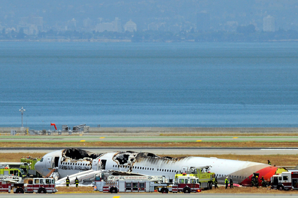 2013年7月6日,在美國舊金山國際機場,救援人員在發生事故的波音777飛機旁工作。