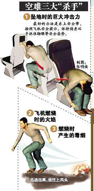 很多業內人士認為,飛機失事后一分半鐘內是逃生的“黃金時間”。能否在飛機失事的瞬間逃生,不僅僅取決于你的臨場反應夠不夠快。澳大利亞教授蓋里爾研究了1983年到2000年間105次墜機事件、2000多名幸存者的受訪記錄,也總結出了6條自救方法。
