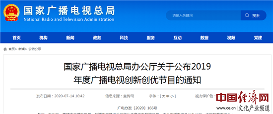 經濟日報-中國經濟網北京7月15日訊 7月14日,國家廣播電視總局公布了2019年度廣播電視創新創優節目。
