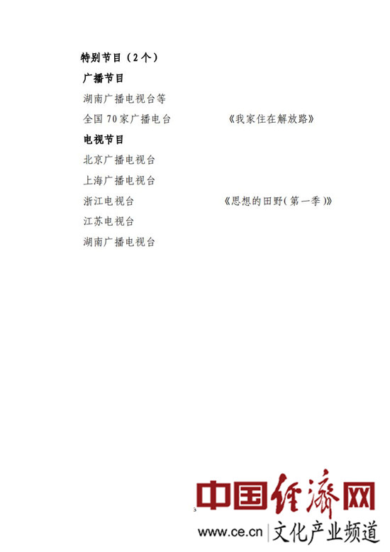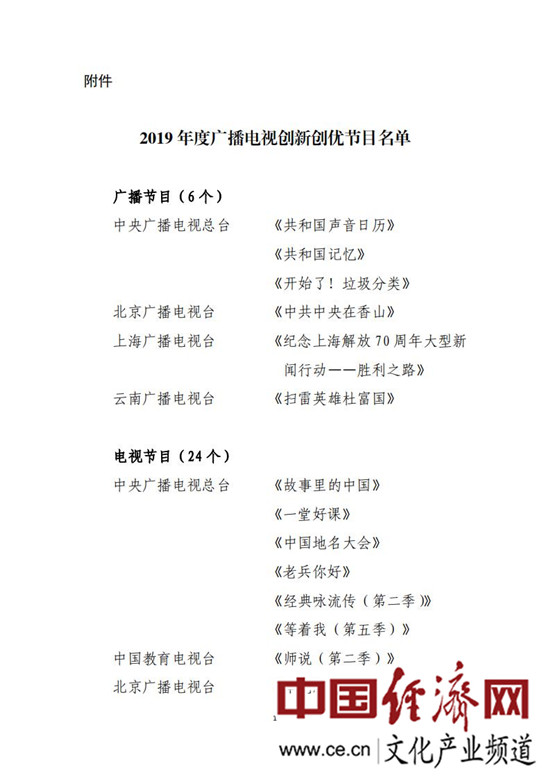 經評議,國家廣播電視總局確定中央廣播電視總臺《共和國聲音日歷》、北京廣播電視臺《中共中央在香山》等6個廣播節目,中央廣播電視總臺《故事里的中國》《中國地名大會》、上海廣播電視臺《這就是中國》、江蘇電視臺《從地球出發》等24個電視節目為“2019年度廣播電視創新創優節目”,每個節目給予5萬元的資金扶持;確定《我家住在解放路》《思想的田野》2個集體創作的節目為“2019年度廣播電視創新創優特別節目”。