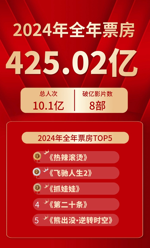 中國經(jīng)濟(jì)網(wǎng)北京1月2日訊 據(jù)國家電影局統(tǒng)計(jì),2024年全年總票房425.02億,城市院線觀影總?cè)舜?0.1億。其中,國產(chǎn)影片票房為334.39億元,占比78.68%。