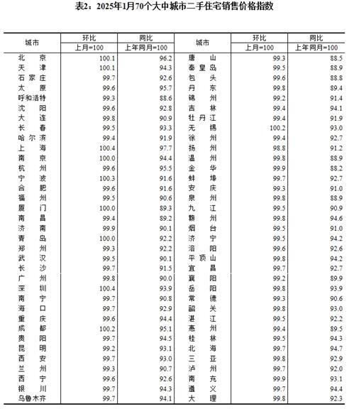 1月份,二線城市新建商品住宅銷售價格環比由上月持平轉為上漲0.1%,為2023年6月以來首次上漲;二手住宅環比下降0.3%,降幅與上月相同。三線城市新建商品住宅和二手住宅銷售價格環比分別下降0.2%和0.4%,降幅均與上月相同。