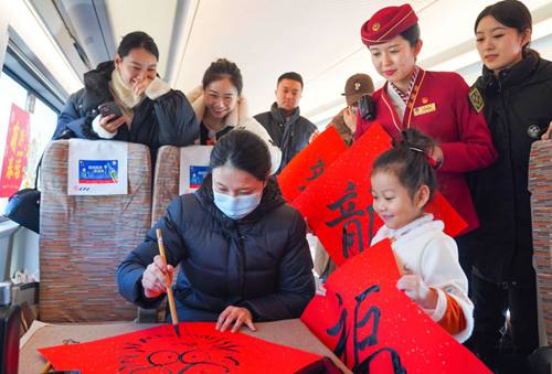 津興城際G8844次列車上,旅客現(xiàn)場手寫書法福字、畫龍頭。(中國鐵路北京局集團有限公司供圖)