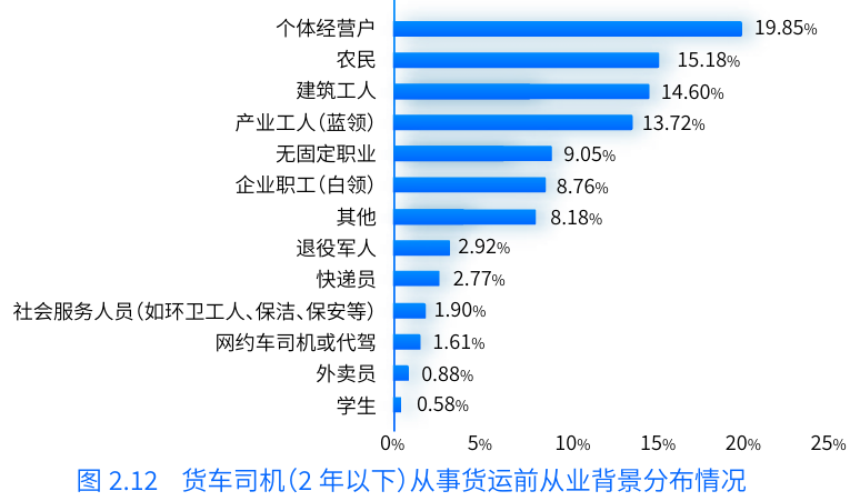 不僅如此,報告中還提到,過往貨運行業對傳統行業從業者的吸引力較強,多為農民、個體經營戶、產業工人(藍領)、無固定職業、建筑工人等群體。而近幾年,轉型從事貨車司機的職業還包含了企業職工(白領)、社會服務人員、學生等,另外,外賣員、快遞員、網約車司機及代駕司機等新型靈活就業者也有部分人群選擇轉行成為貨車司機。