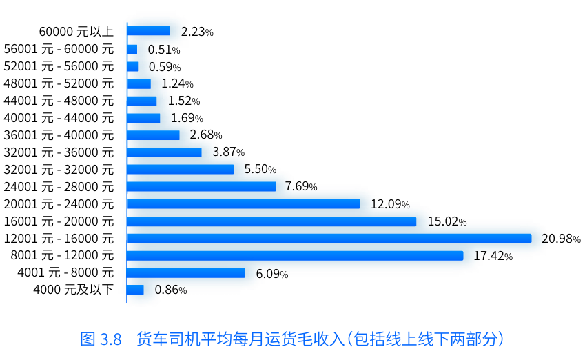 報告中提到,貨車司機每月毛收入平均值為20441元。在剔除油(電、氣)費、高速費、保險、保養和平臺信息技術服務費等成本后,貨車司機平均月凈收入均值為12063元。