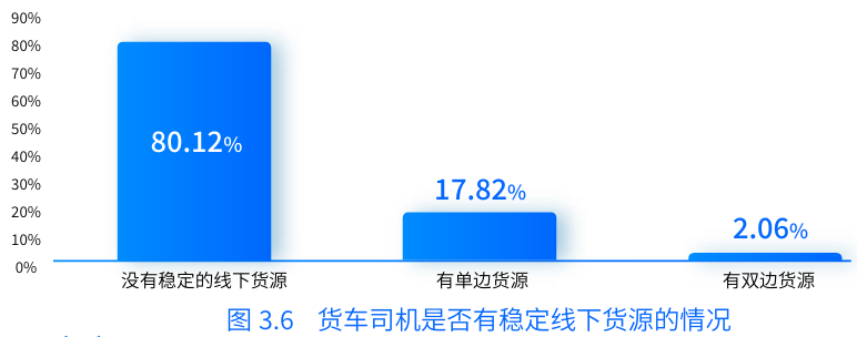 報告中提到,約80.12%的司機沒有穩定的線下貨源供應,貨車司機很少能夠掌握穩定線下貨源。大部分司機面臨貨運工作的不穩定性,需要花費大量時間和精力去尋找和獲取貨源,這不僅降低了他們的運輸效率,也增加了運營成本。