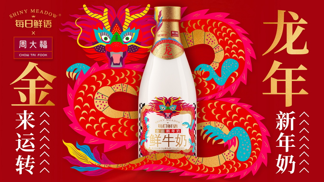 品牌跨界聯名,不斷活化品牌,帶來增益轉化。春節期間,每日鮮語攜手周大福,推出“金運新年奶”,開啟“龍來運轉”新一年,為消費者帶來“黃金”營養。