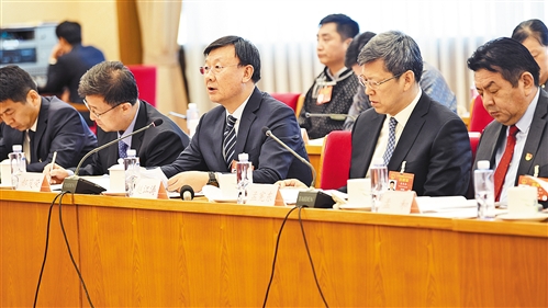 上圖 3月12日,人大內(nèi)蒙古代表團(tuán)舉行全體會(huì)議。全國人大代表、內(nèi)蒙古自治區(qū)包頭市市長趙江濤(中)表示,生態(tài)文明建設(shè)利國利民。 本報(bào)記者 李景錄攝