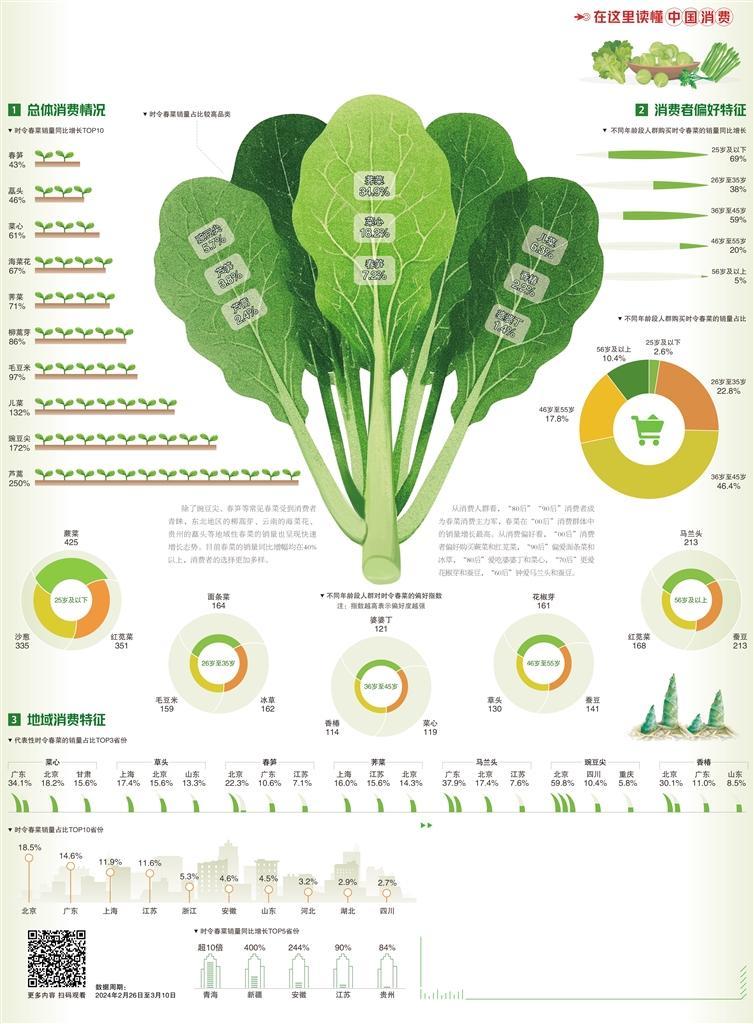 受氣溫偏暖影響,今年春菜提前了半個月左右上市,春菜消費較早升溫。數據顯示,薺菜、菜心、春筍、兒菜、豌豆尖、蘆筍、蘆蒿、香椿、婆婆丁成為線上熱銷春菜。其中,蘆蒿、豌豆尖、兒菜銷量分別同比增長250%、172%、132%。