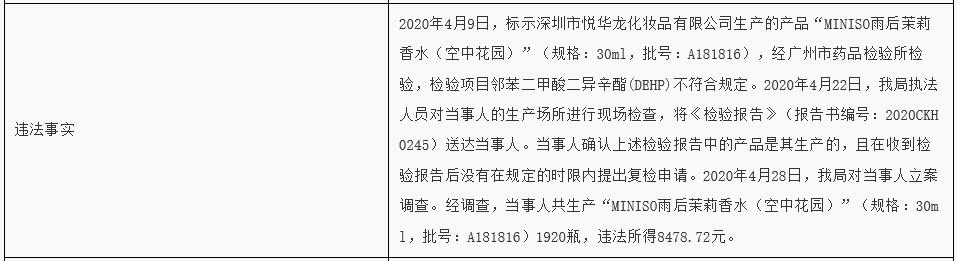 廣東省藥品監督管理局官網公布的行政處罰決定書顯示,2020年4月9日,標示深圳市悅華龍化妝品有限公司生產的產品“MINISO雨后茉莉香水(空中花園)”(規格:30ml,批號:A181816),經廣州市藥品檢驗所檢驗,檢驗項目鄰苯二甲酸二異辛酯(DEHP)不符合規定。