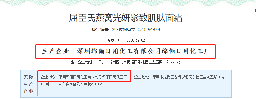 記者通過國產非特殊用途化妝品備案平臺查詢得知,深圳綿儷日用化工有限公司是屈臣氏燕窩光妍緊致肌肽精華液、歐薇蔻肌肽水光晶致面膜、護加宜精研臻護雙萃精華液等800多款產品的生產企業。