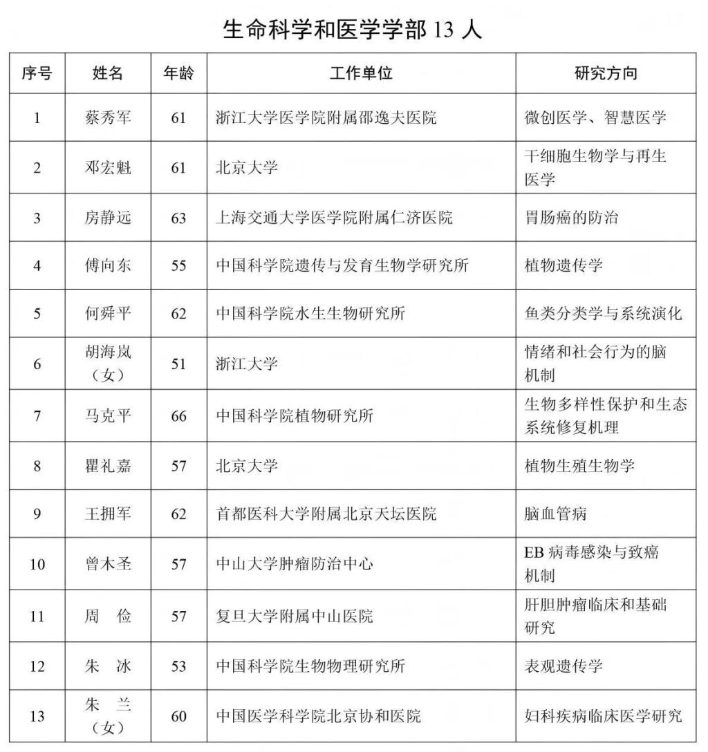 中國科學院選舉產生了73名中國科學院院士和27名中國科學院外籍院士,其中生命科學和醫學學部13人。