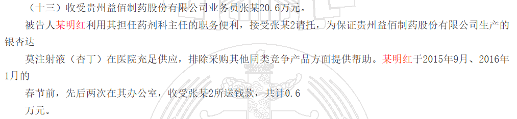 根據判決書,被告人某明紅利用其擔任藥劑科主任的職務便利,接受貴州益佰制藥股份有限公司業務員“張某2”請托,為保證貴州益佰制藥股份有限公司生產的銀杏達莫注射液(杏丁)在醫院充足供應,排除采購其他同類競爭產品方面提供幫助。某明紅于20159月、20161月的春節前,先后兩次在其辦公室,收受“張某2”所送錢款,共計0.6萬元。