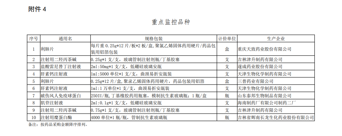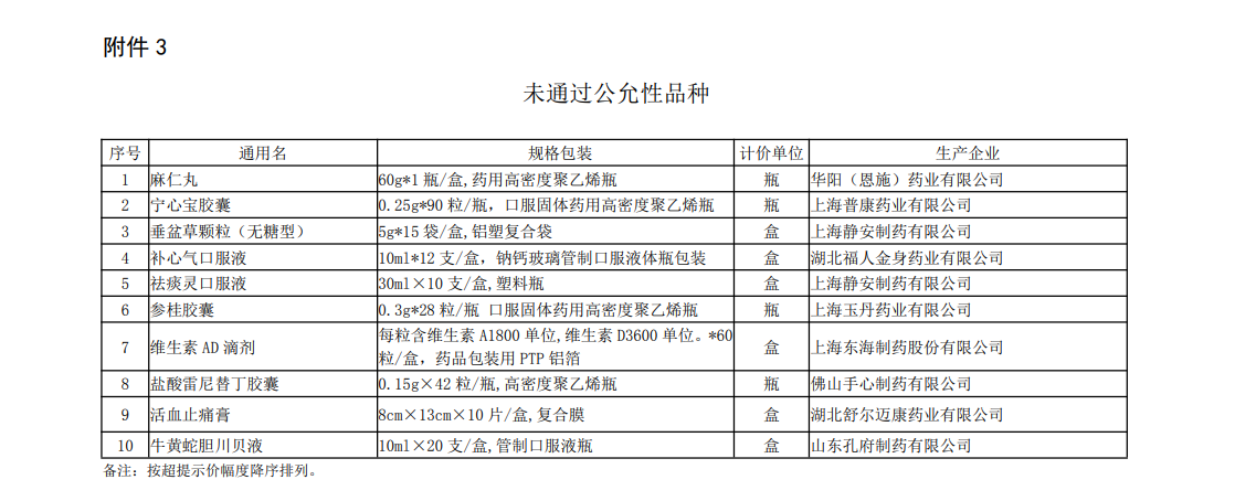 譬如,新申請超“黃線”品種名單中,北京同仁堂科技發(fā)展股份有限公司制藥廠麻仁潤腸軟膠囊、云南白藥集團(tuán)股份有限公司云南白藥氣霧劑系獨家品種;原在庫超“黃線”品種名單中,浙江泰利森藥業(yè)有限公司瑞格列奈二甲雙胍片(II)是獨家品種;未通過公允性品種名單中,湖北福人金身藥業(yè)有限公司補(bǔ)心氣口服液、上海玉丹藥業(yè)有限公司參桂膠囊是獨家品種;重點監(jiān)控品種名單中,吉林津升制藥有限公司注射用二羥丙茶堿為獨家品種。