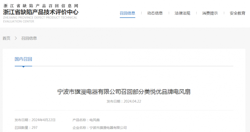 目前,寧波市旗漫電器有限公司受缺陷調(diào)查影響按照《消費(fèi)品召回管理暫行規(guī)定》的要求,主動(dòng)向浙江省市場(chǎng)監(jiān)督管理局和寧波市市場(chǎng)監(jiān)督管理局報(bào)告了召回計(jì)劃,將自即日起,召回2023年5月22日至25日期間制造的部分美悅優(yōu)品牌型號(hào)QM-LD001電風(fēng)扇(循環(huán)扇),涉及數(shù)量297臺(tái)。