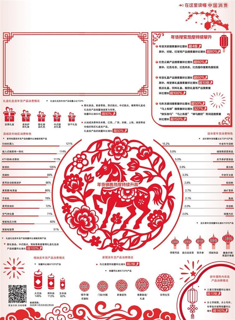 今年年貨消費,既有傳統年味的溫馨熱鬧,又有品質生活的全新表達。從紅火喜慶的馬年裝飾、寓意吉祥的節慶禮盒,到智能家電、健康按摩、家政服務等新年貨走俏,再到春節旅行預訂火熱,折射出大眾消費從“圖熱鬧”向“重品質、重實用、重心意”轉變。縣域農村市場里,掃地機器人、智能廚電等成為返鄉孝敬長輩的熱門年貨,更是讓科技溫度融入團圓時刻。新舊交融、城鄉共進的年貨圖景,既藏著中國人不變的團圓情結,也映照著煙火氣里不斷升級的美好生活。