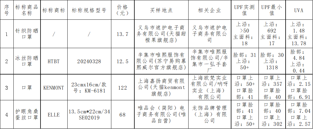 檢測發現,45款樣品中,4款樣品不符合標準要求,例如標稱由義烏市遮護電子商務有限公司生產銷售的針織防曬口罩,其實測UPF值僅18(主面料),T(UVA)AV值高達13.78(主面料);其余41款樣品UPF>40并且T(UVA)AV<5%,防曬性能良好。