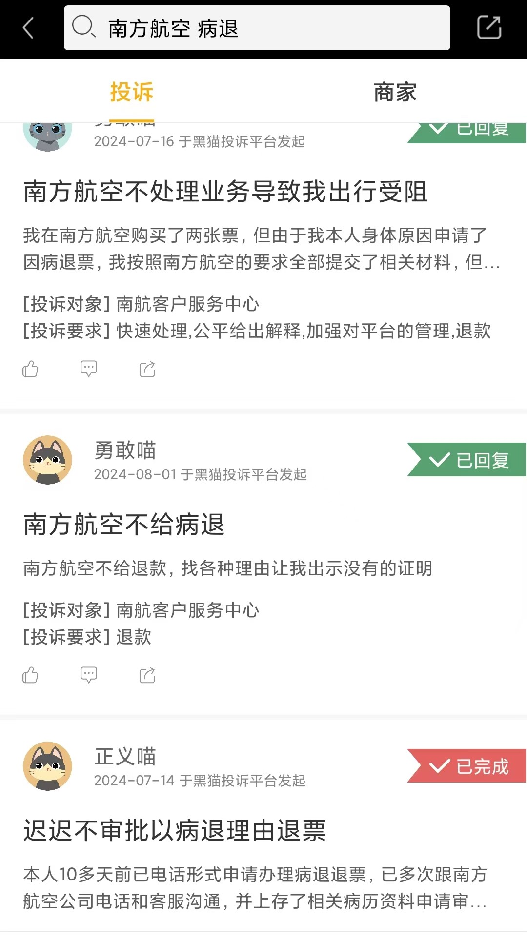 5月31日,有消費者投訴稱,和同行人一起提交病退材料,但南方航空公司在10天之后只給同行人退了機票錢。客服人員答復稱“因為其不是用同一個手機號下單的”,這個理由與南航的規定明顯不符。6月25日,有消費者投訴稱,根據南航APP客服人員的引導提交了病退申請,后來從其他平臺看到,客服人員講的規則和南方航空公司的規則不一致,可能會導致病退申請失敗,扣除手續費,當時看到病退申請還未審核,想撤回,但屢次溝通后仍無法撤回。