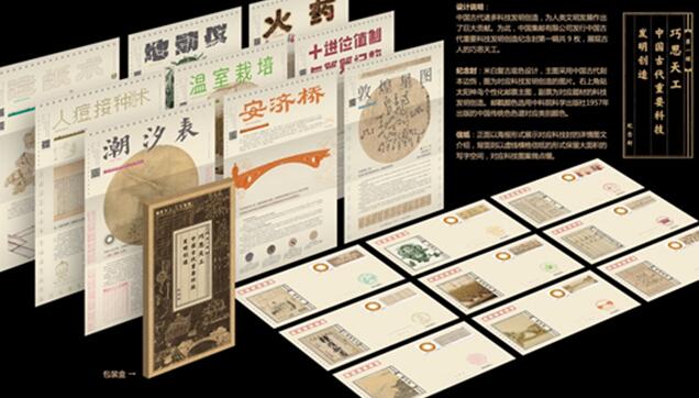 該系列紀(jì)念封由張泮儉、張慶鋒設(shè)計(jì),風(fēng)格整體統(tǒng)一又有特色,兼具科學(xué)與藝術(shù)之美,既能感受到傳統(tǒng)文化的古香古色,又在設(shè)計(jì)和制作上大膽創(chuàng)新。每類郵戳對(duì)照中國(guó)傳統(tǒng)色色譜進(jìn)行色系標(biāo)注,顏色有所區(qū)別。紀(jì)念封配有精美封套,通過(guò)主圖、郵戳、個(gè)性化郵票直觀表現(xiàn)科技成果,同時(shí)在封里增加了一張?jiān)O(shè)計(jì)精良的三折插頁(yè)卡片——頁(yè)式“說(shuō)明書(shū)”,掃描封上二維碼,還可以觀看動(dòng)畫(huà)短片,參與互動(dòng)游戲。
