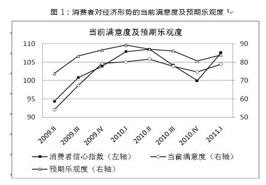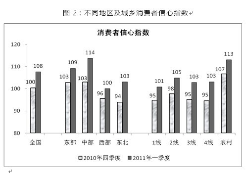 2011年一季度中國消費(fèi)者信心指數(shù)為108,比2010年四季度大幅上升8點(diǎn),接近近兩年高點(diǎn)。消費(fèi)者對(duì)當(dāng)前經(jīng)濟(jì)形勢(shì)的滿意度和對(duì)未來經(jīng)濟(jì)走勢(shì)的預(yù)期樂觀度均明顯上升,持樂觀態(tài)度的消費(fèi)者比重均接近兩年內(nèi)的最高點(diǎn)。