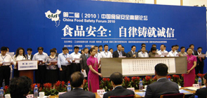 主題為“食品安全:自律鑄就誠信”的第二屆(2010)中國食品安全高層論壇今天在北京舉行。中糧聯合華潤、娃哈哈等100多家知名食品企業在論壇上共同發表誠信宣言,向社會鄭重承諾:鉻記榮辱義利,維護人民福祉。