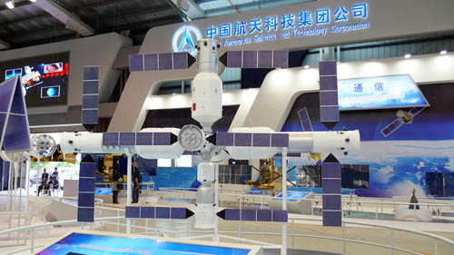 在此次航展中,中國航天科技集團公司推出代表月球探測工程最新成果的“嫦娥二號”衛(wèi)星模型,代表“北斗導(dǎo)航”工程、直徑達7米、蔚為壯觀的天地一體衛(wèi)星運行沙盤,1:1的“天宮一號”目標飛行器模型、新一代運載火箭以及代表深空探測計劃的“螢火一號”衛(wèi)星模型等國家重大工程項目近100項新展品首次亮相。圖為長期有人照料的空間站模型。(宗文)